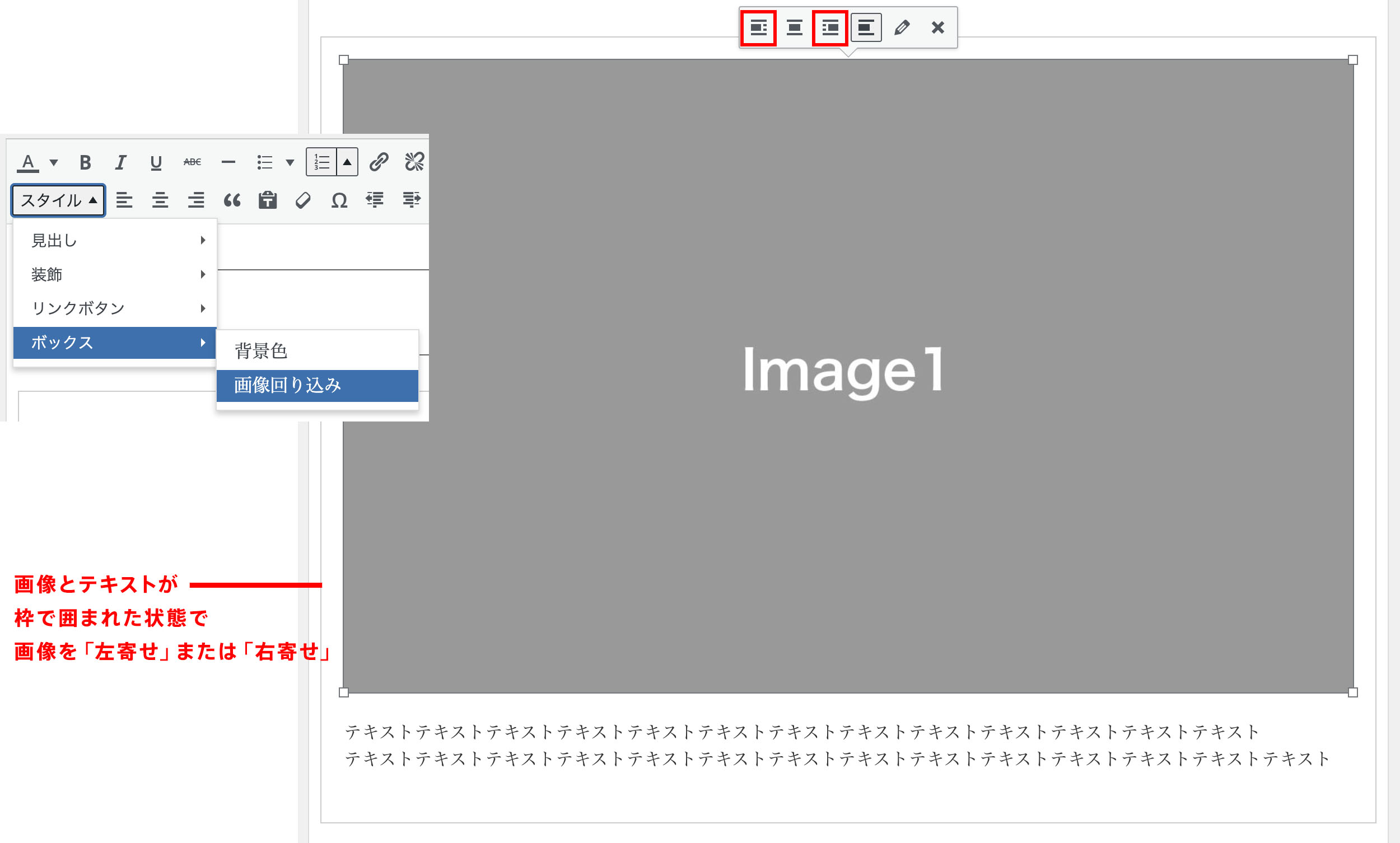 ③ 画像とテキストをまとめて選択して、「スタイル:ボックス:画像回り込み」を選択(画像とテキストが薄い枠線で囲まれます)