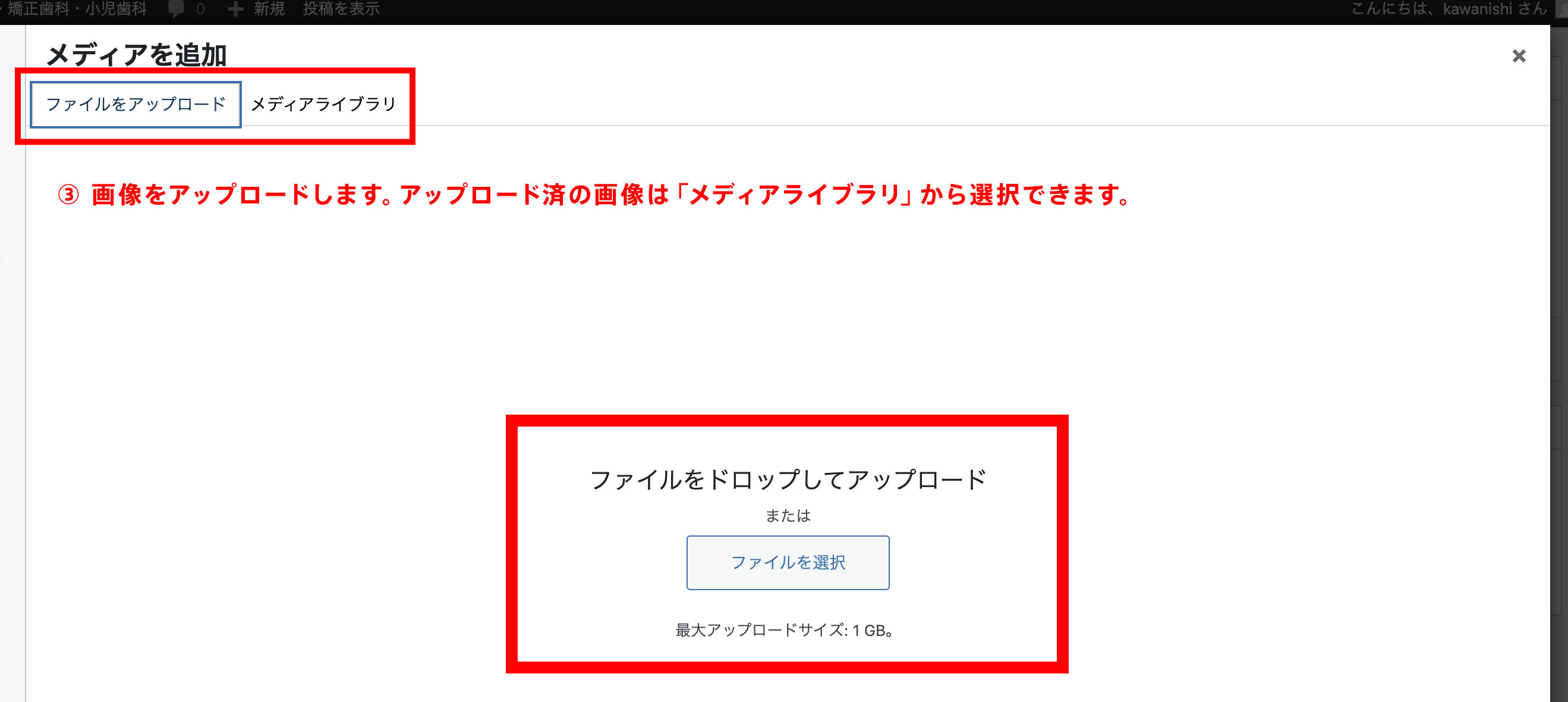③ 画像をアップロードします。アップロード済の画像は「メディアライブラリ」から選択できます。