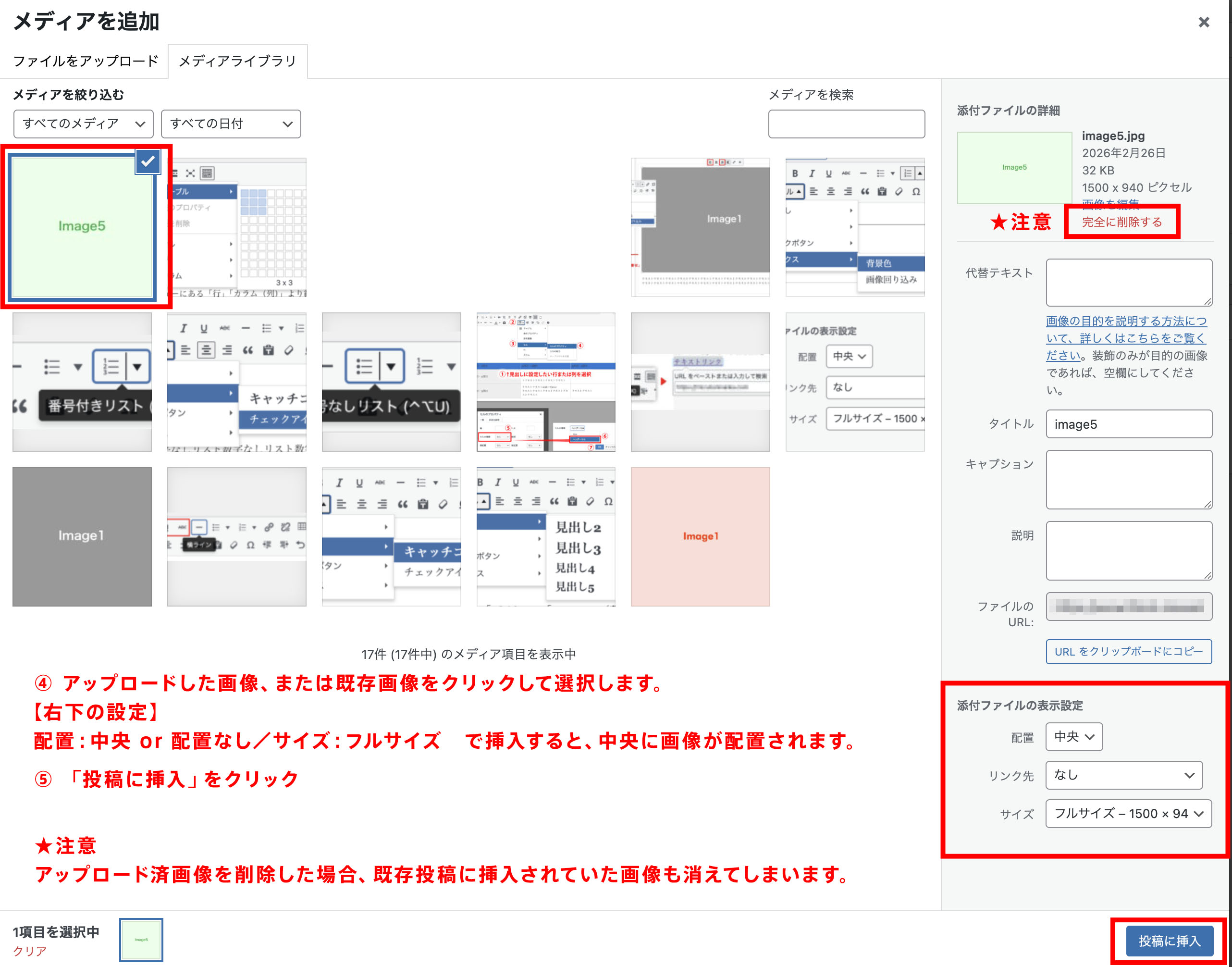 アップロード済画像を削除した場合、既存投稿に挿入されていた画像も消えてしまいます。