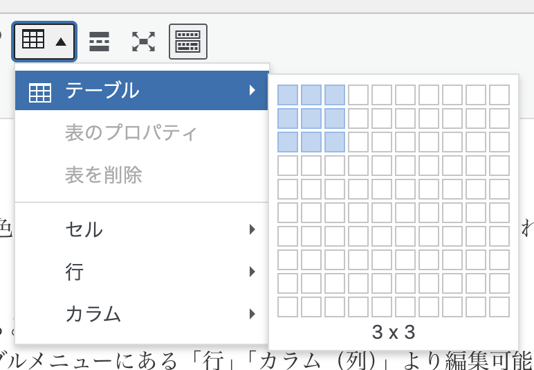 作成後に行・列を増減させたい場合は、前述テーブルメニューにある「行」「カラム(列)」より編集可能です。